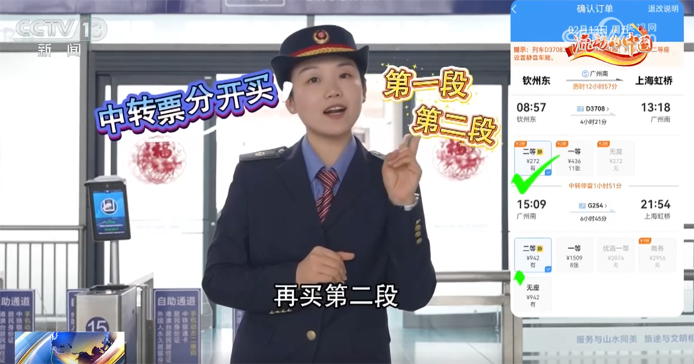 刘卿卿:中转选站技巧,优先选大站,比如说省会城市、枢纽站,中转车次更多,衔接更顺畅,避免选小站,中转车次少,容易赶不上;注意:中转车票要分开买,先买第一段,再买第二段,确保两段车次衔接时间至少留30分钟。最后提醒,票源紧张,捡到票就赶紧付款,可别犹豫!